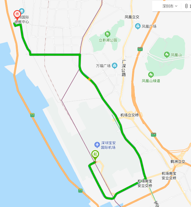 共計(jì)約18公里,途經(jīng)領(lǐng)航高架橋、寶安大道,出租車用時(shí)約32分鐘;